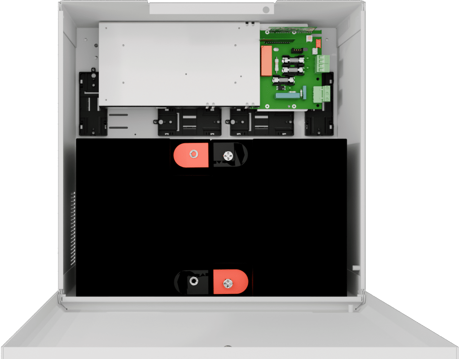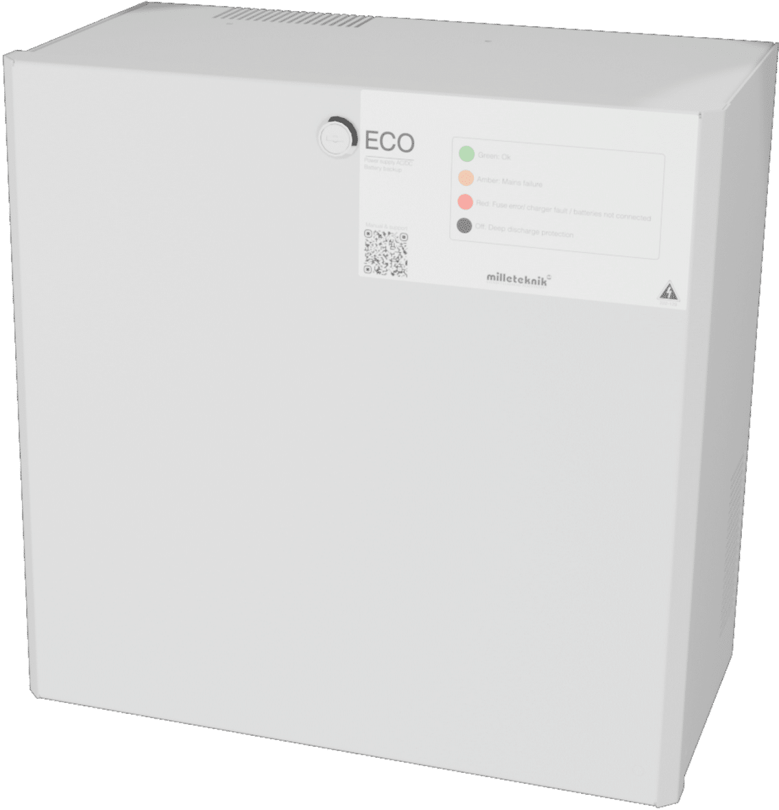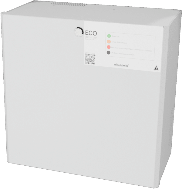 Batteribackup ECO 24V 10A L är en primärswitchad strömförsörjning med laddare och plats för upp till 2 st. 45 Ah batterier. Tre VMC-platser för tillvalskort gör enheten flexibel för olika typer av säkerhetsinstallationer. Kapslingen är kompakt, H 370 x B 390 x D 210 mm. Den levereras med 20 mm väggdistanser för smidig kabeldragning bakom skåpet och har optimerad ventilation där luft sugs genom nätaggregatet och trycks ut längs sidorna. För ökad säkerhet är kapslingen utrustad med nyckellås och sabotagekontakt. ECO 24V 10A L har inbyggt skydd mot överbelastning, överspänning, övertemperatur, kortslutning och djupurladdning. Larm indikeras via två utgångar och omfattar bland annat bortkopplade batterier vid uppstart, externt larm via tillvalskort, fördröjt nätavbrottslarm vid 26,4 V, låg batterispänning vid 24 V, säkringsfel samt sabotage. Utgångarna består av en dubbelpoligt avsäkrad och en enkelpoligt avsäkrad. Kapslingen är svart pulverlackerad med struktur, försedd med LED för larmindikering och har flera knockouts för kabelgenomföring, inklusive en i ryggplåten. Enheten väggmonteras. Batterier tillkommer. ECO-serien har Controlled Charging (max 30 % av batterikapacitet) och Cold start för drift utan 230 V-nät. 2 års garanti